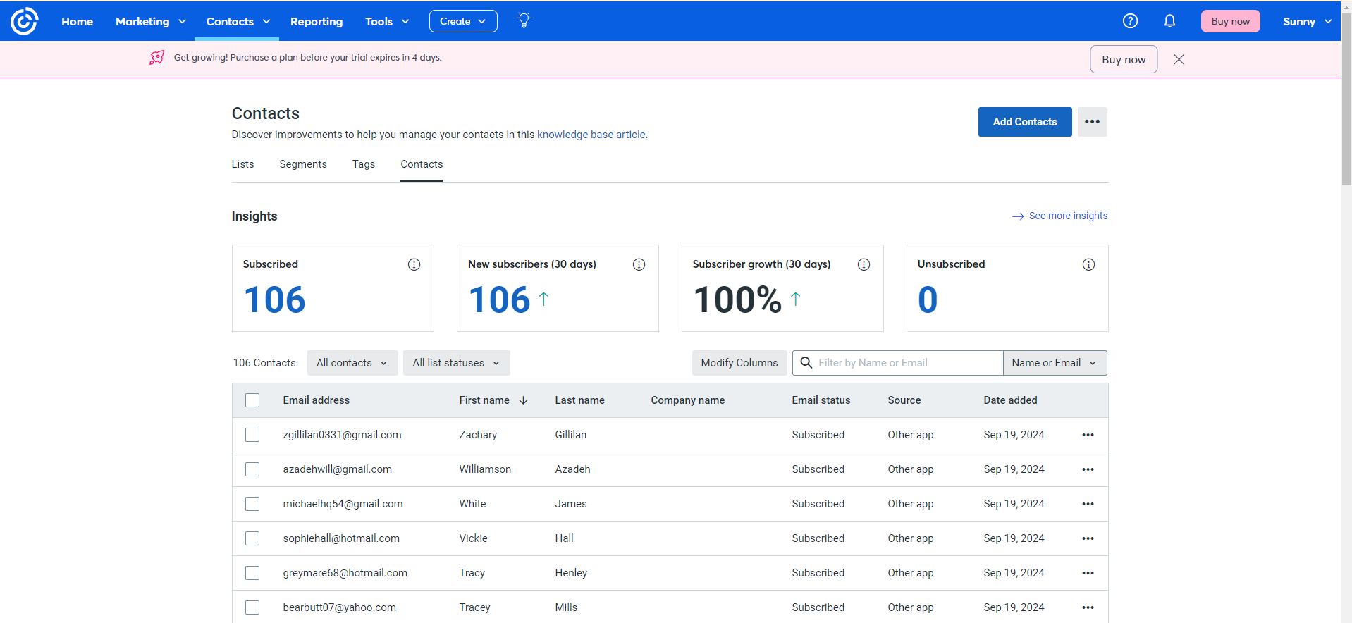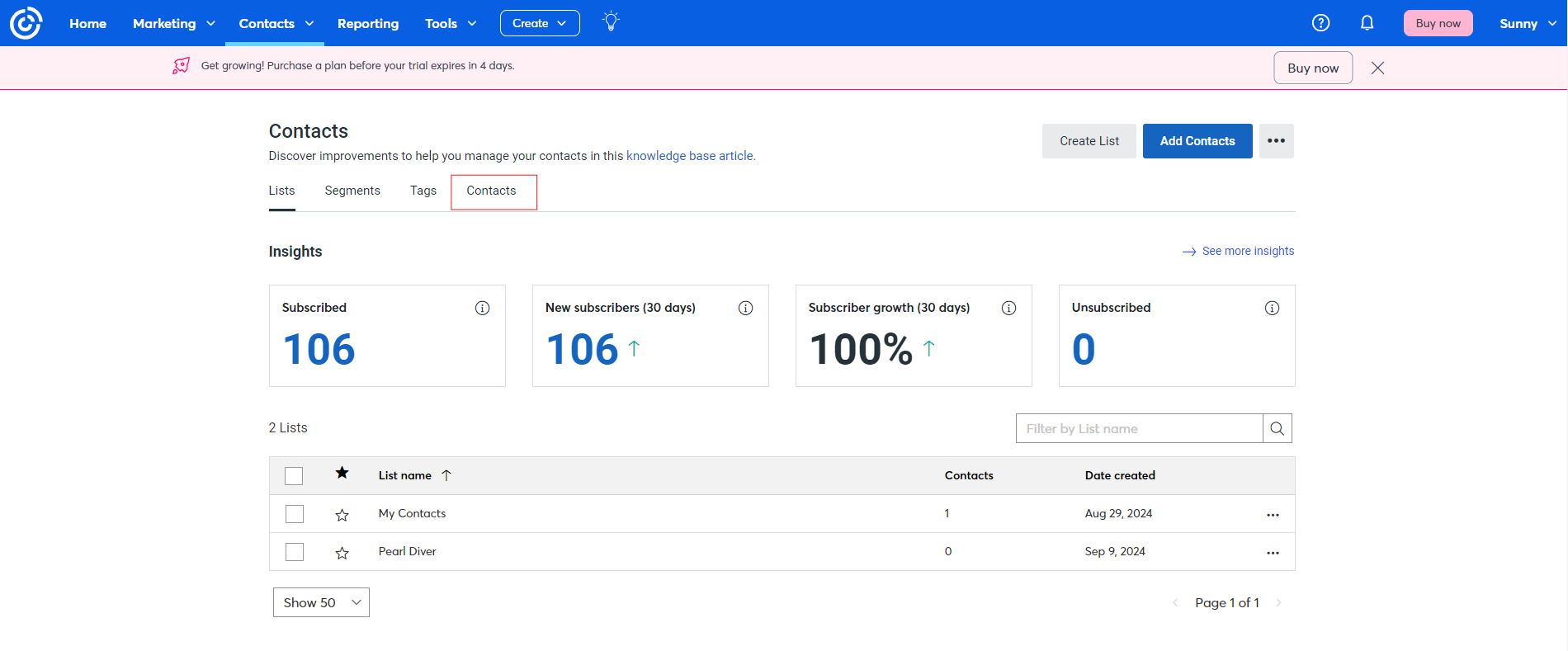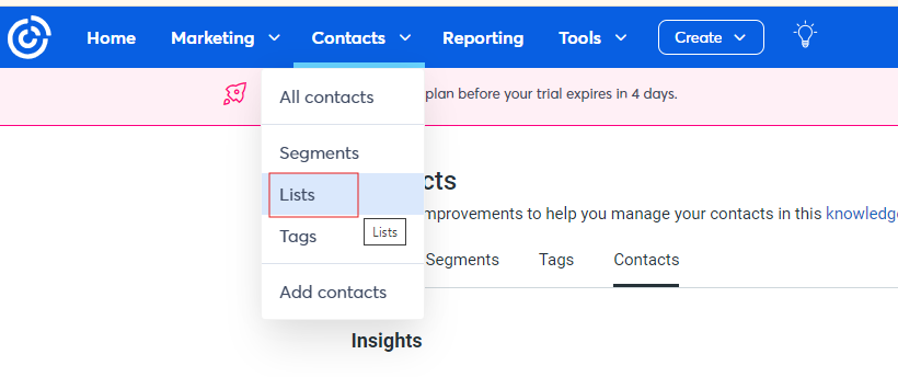 1. Sign in to your Constant Contact account and click Contacts, then Lists