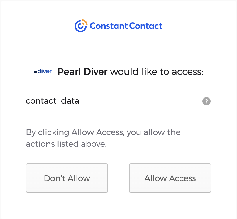 - The Pearl Diver integration asks permission to access the scope contact_data in Contact Contact. This is so that the integration can create and update Constant Contact contacts. The integration will never delete contacts.