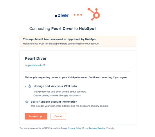 The Pearl Diver integration asks permission to access the following scopes in HubSpot: