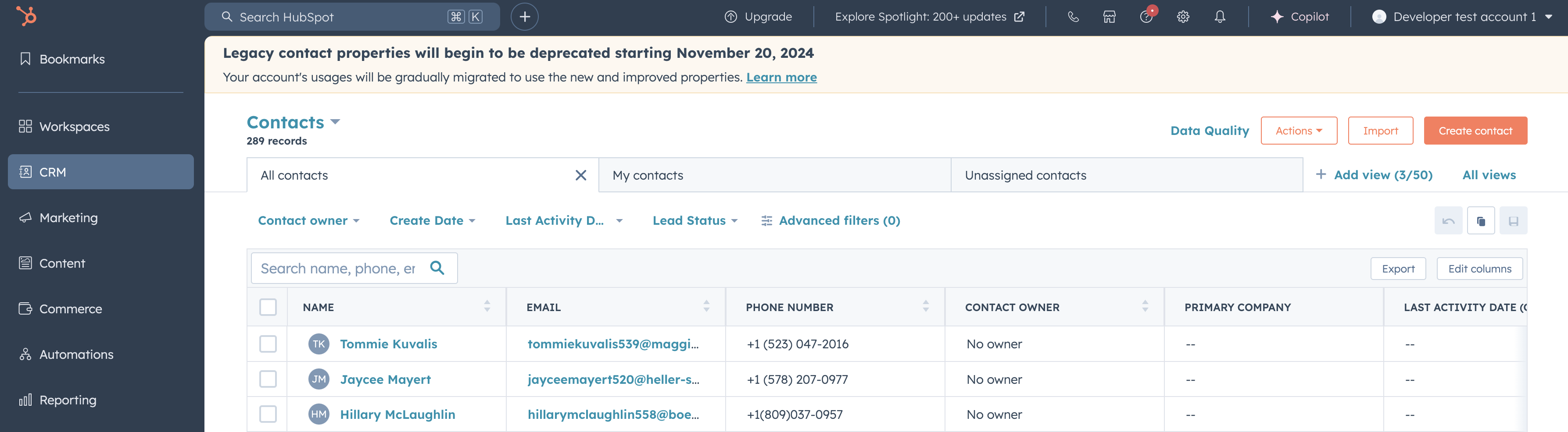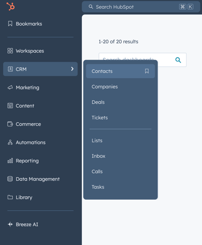 1. Sign into your HubSpot account and hover over CRM and click Contacts