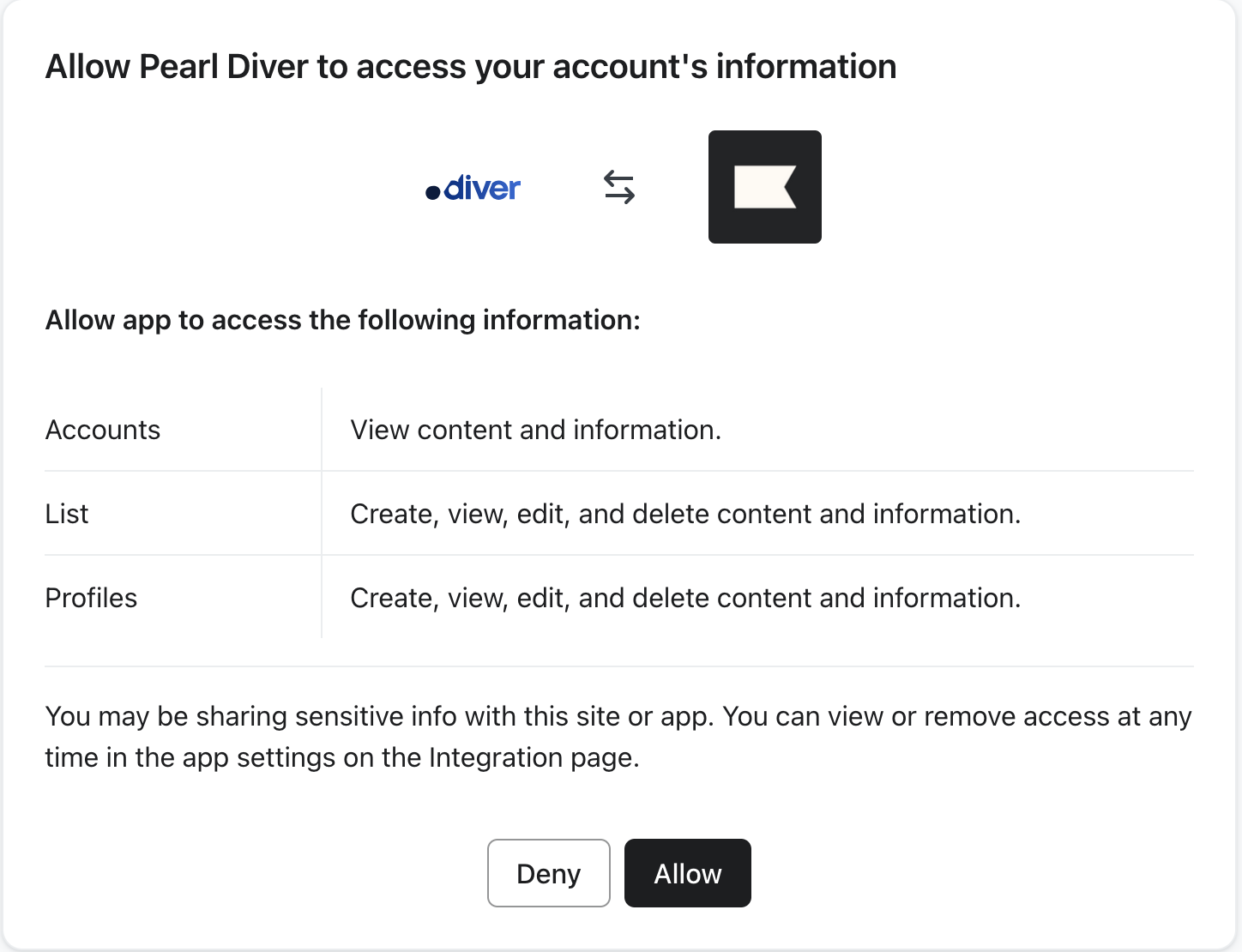 ✅These permissions are so the integration can create a Pearl Diver list to create and sync and update in Klaviyo. The integration will never delete contacts. To proceed, click "Allow".