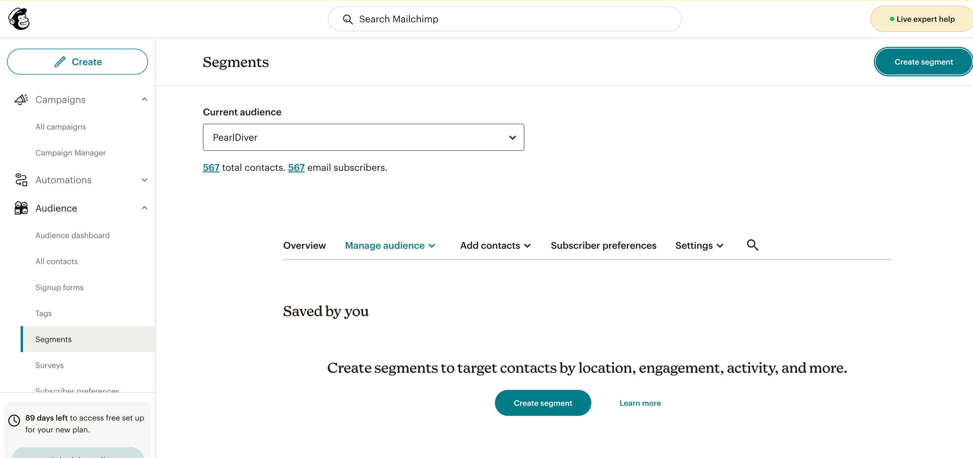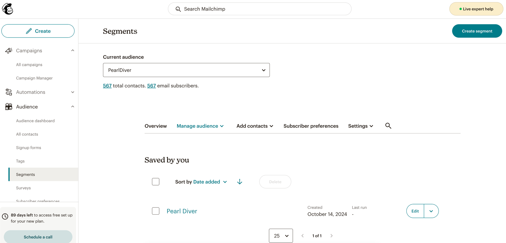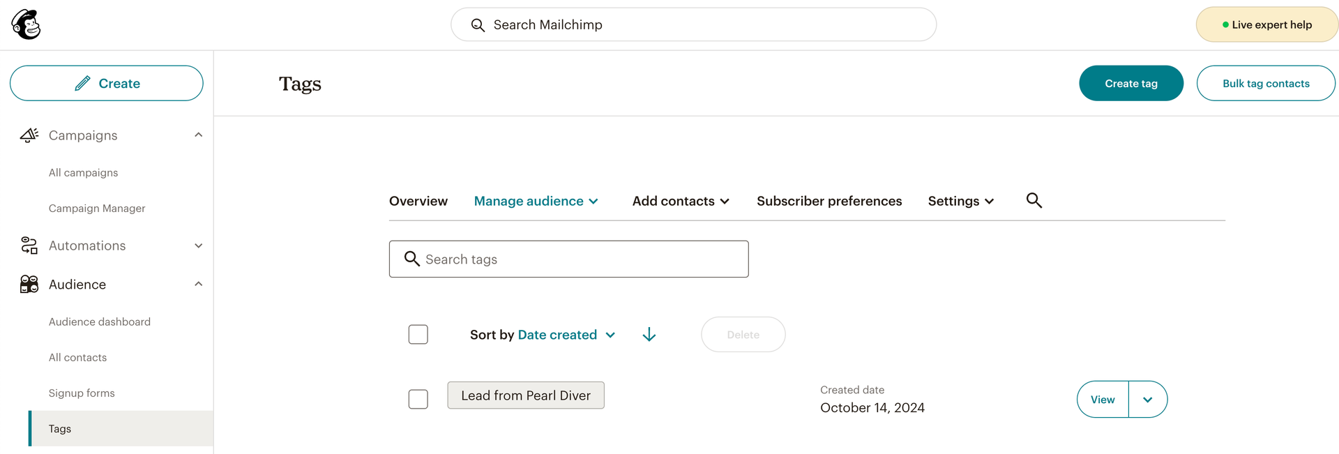 - Click the 1 audience available and filter contacts from ‘PearlDiver' using tags. Contacts from ‘PearlDiver' has 'Lead from Pearl Diver' tag. Click 'View’ to see the contacts.