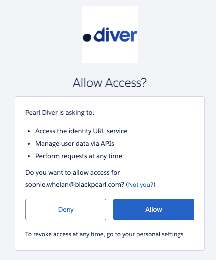 ✅These permissions are so the integration can create a Pearl Diver list to create and update Salesforce lead contacts against. The integration will never delete contacts. To proceed, click Allow.