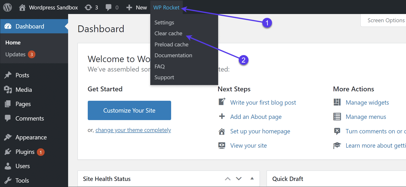 - Recommend you clear the website cache to ensure the pixel loads immediately - there will usually be a plugin installed for this. Look for Wp rocket at the top for example. See image below.
