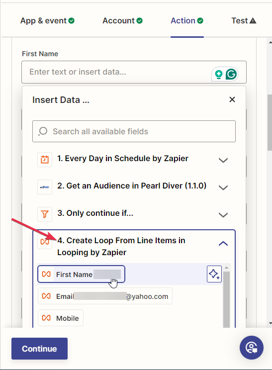 This will result in fields from the "Looping by Zapier" which you can use in your action to export the data. This should look something like the below.