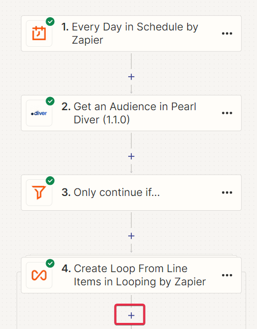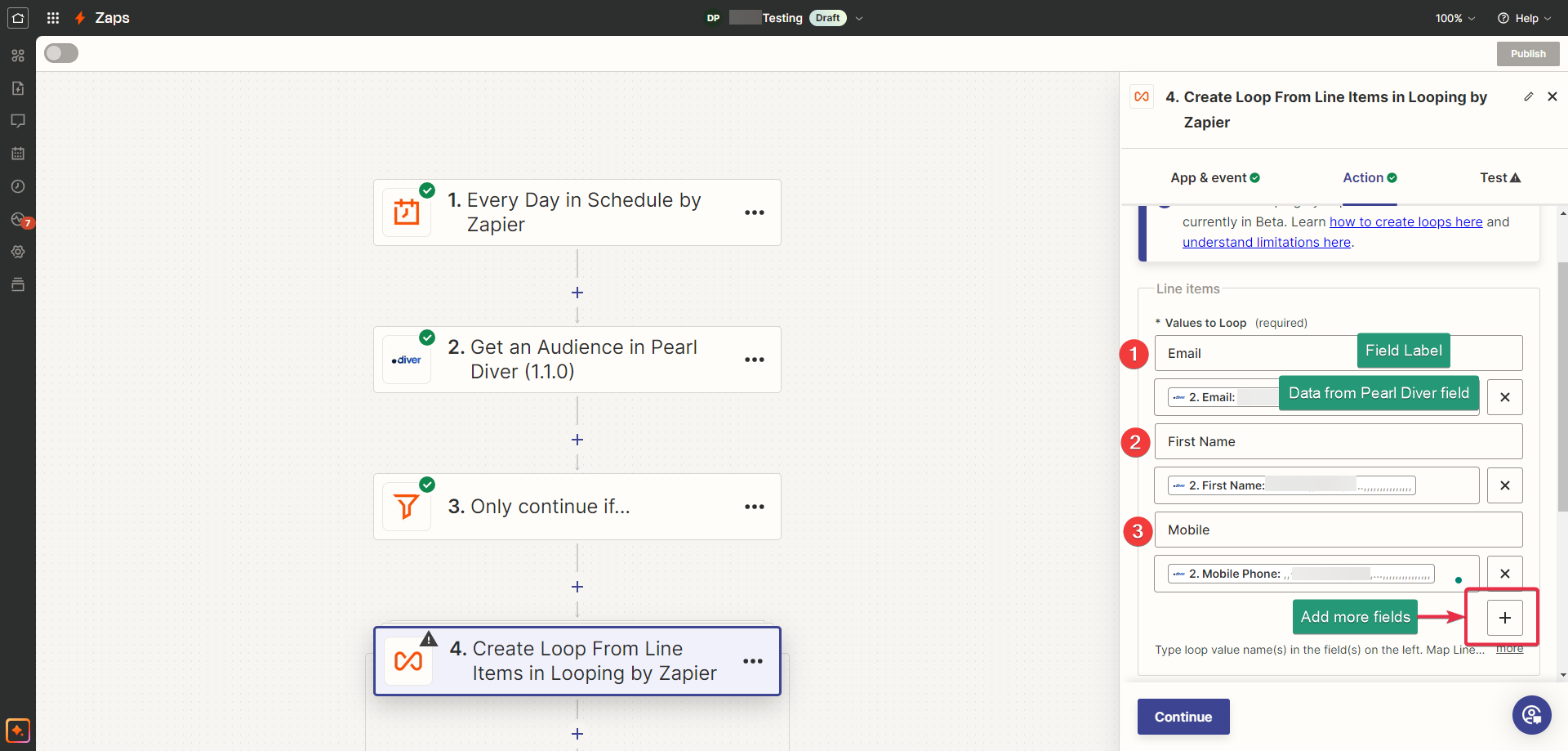 Note that the final steps will use the data fields created by the Loop (3) and not from the Pearl Diver action (2).
