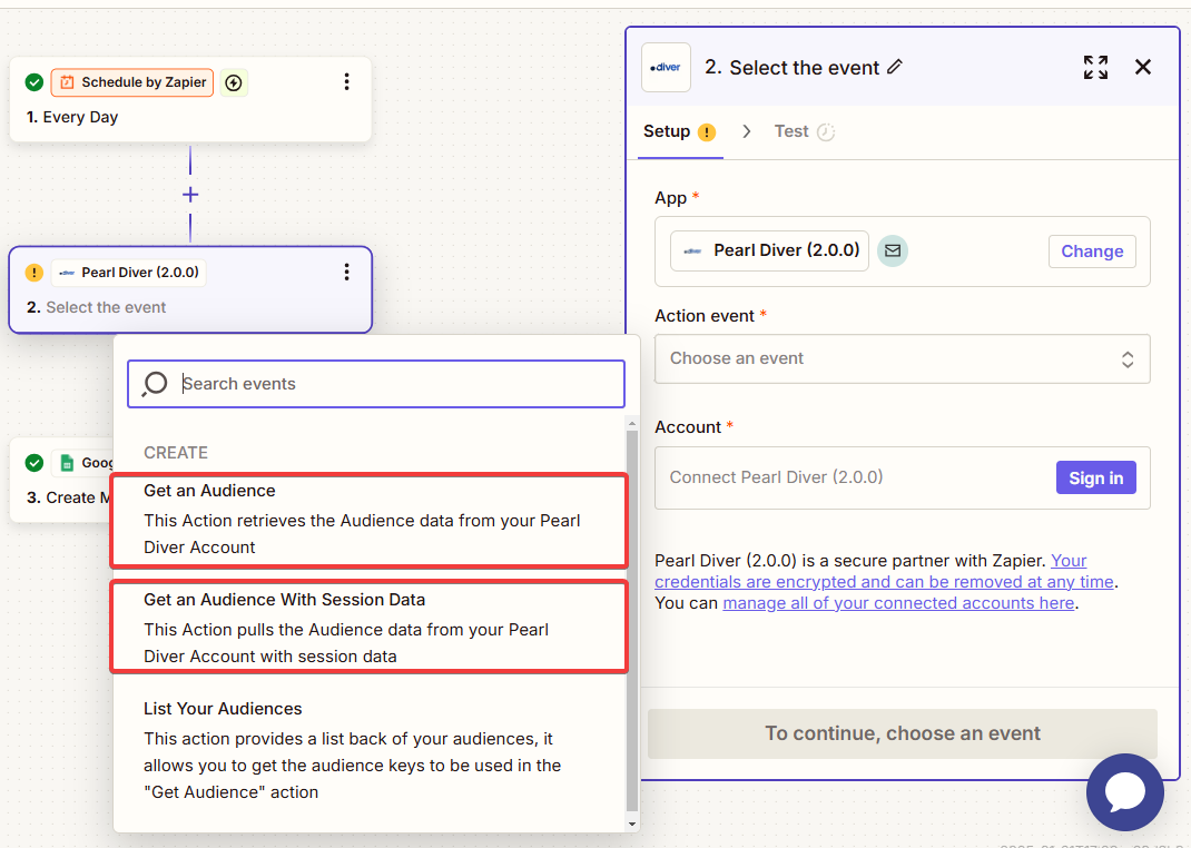 To setup the action you will need to edit the Pearl Diver action and update the Action event to either Get an Audience or Get an Audience With Session Data.