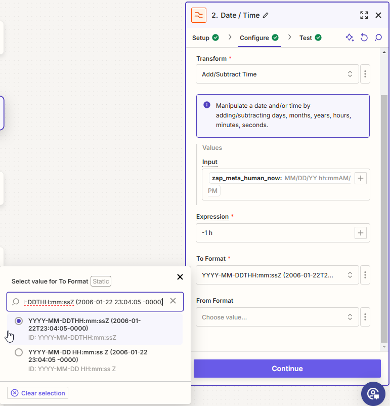 - In the To Format, set the value 'YYYY-MM-DDTHH:mm:ssZ (2006-01-22 23:04:05 -0000)' which results in the datetime format YYYY-MM-DDTHH:mm:ssZ