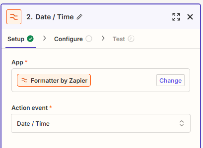 - Select the output from the 'Formatter by Zapier' Date / Time